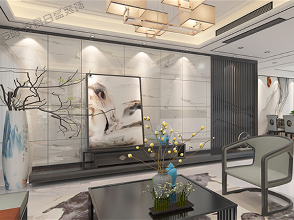 玄关以山水壁画壁纸装饰墙面,实木框裱边框,简单中多了中式之韵;设计师将大理石作为立面,理石肌理所呈现的水墨描画山峦叠嶂、灰墨之意,与玄关高低柜的设计,便于日常出入的使用,与吊灯碰撞出中式祥和。