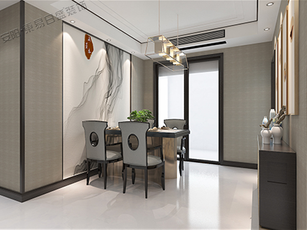 餐厅以淡蓝色的餐桌椅承载着平和而安定的生活态度,围合出低调合乐的*餐氛围;通过墙体结构自然凸显空间感,朴素的材质与米白大理石地面漾动着中式清和;矩形水晶灯几何艺术空灵质感,与实木家具呈对比,却格外精致;餐桌椅造型简洁,餐椅则呼应铁艺吊灯,带来些许沉稳厚重;中式水墨画背景墙栩栩如生,纯净之中蕴有暖调,让用餐氛围更惬意,营造出中式的闲逸悠然,在看似平和的调性中,将诗画与设计和谐对话,古香古色的空间自成一趣。木线画框般饰以餐厅墙面,设计师除了点缀一副抽象画作装饰外,多以留白手法灵动表达空间;