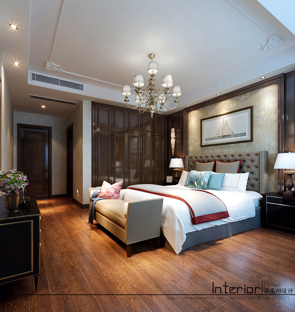 卧室以棕色等中性色调来营造素暖和沉稳的气氛,金箔吊顶自带光泽带来冷峻的奢华和质感;衣帽间分割在另一侧,在欧式和新古典的基调下,棕色木框、欧式台灯都张扬着华丽;木地板和新古典家具组成的典雅,让人享受华丽之外的安谧。