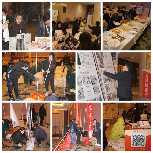 上午大家早早的到达华强诺华廷酒店布置会场,整理展架,准备活动展示的东西,更重要的是东易日盛装饰为每位到会场的业主准备了丰富的冷餐。