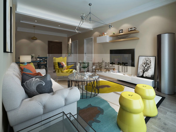 做到了“麻雀虽小五脏俱全”,整体装饰风格是正流行的北欧风格,轻松、贴近生活,装修材料简单、性价比高,呈现的效果却是非常温馨,如今当道的重装饰、轻装修用北欧风格来体现再合适不过了,介于该户型购买群众多为年轻人,软装中采用了强烈的色彩主题,使其视觉冲击力加强,装饰画与饰品都是非常轻松、非常家居化的,但却不随意,不会给人造成“东西贵、家里用不了”的感觉,使人感觉这是我可以拥有的“家”。